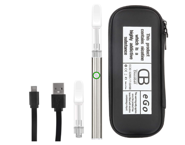 This Discoball CBD Vape Pens Starter Kit includes Ceramic mouthpiece Stainless Steel Coil Pyrex, Vaping Hemp Oil E-Cigarette with 1 Spare 1.0ml Atomizer Set, and No Nicotine.