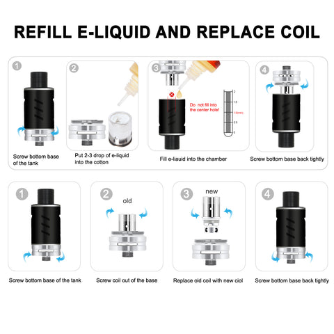 Tighten the Battery and Atomizer properly, avoid loose or over tighten. Read the manual carefully before using this product.