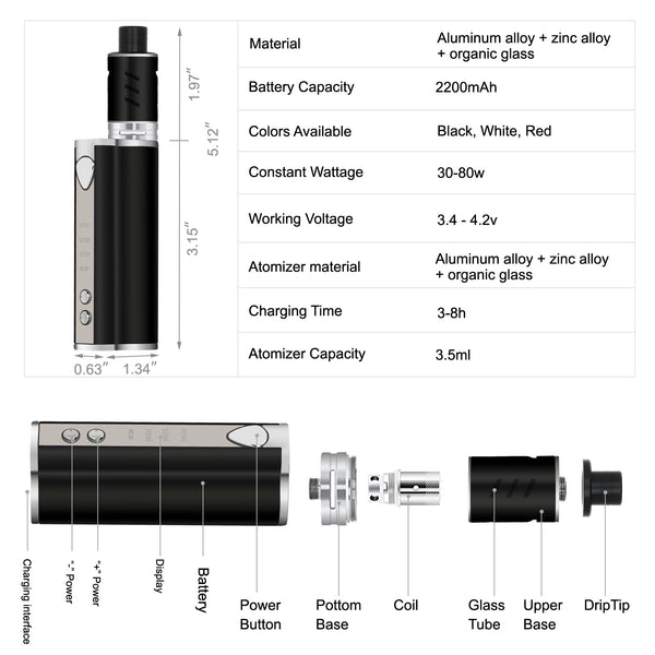 PACKAGE INCLUDED1 x 2200mAh Mod Battery 1 x Atomiser 1 x USB Cable 1 x User Manual |